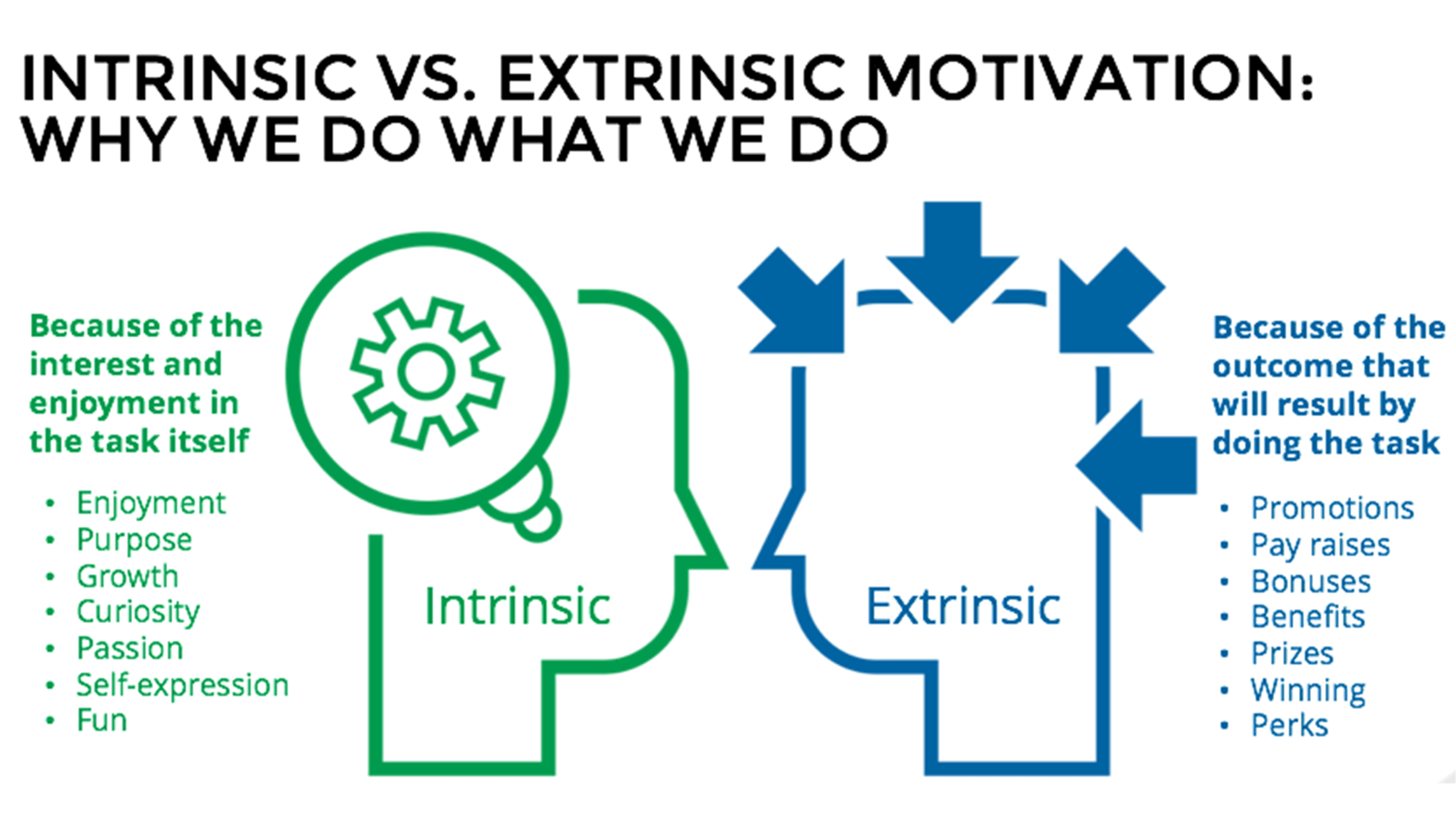 Extrinsic rewards are great to promote initial action but they don’t encourage ongoing positive behavior change. Intrinsic motivation is related to performance, work effort, creativity, retention and higher … satisfaction.
