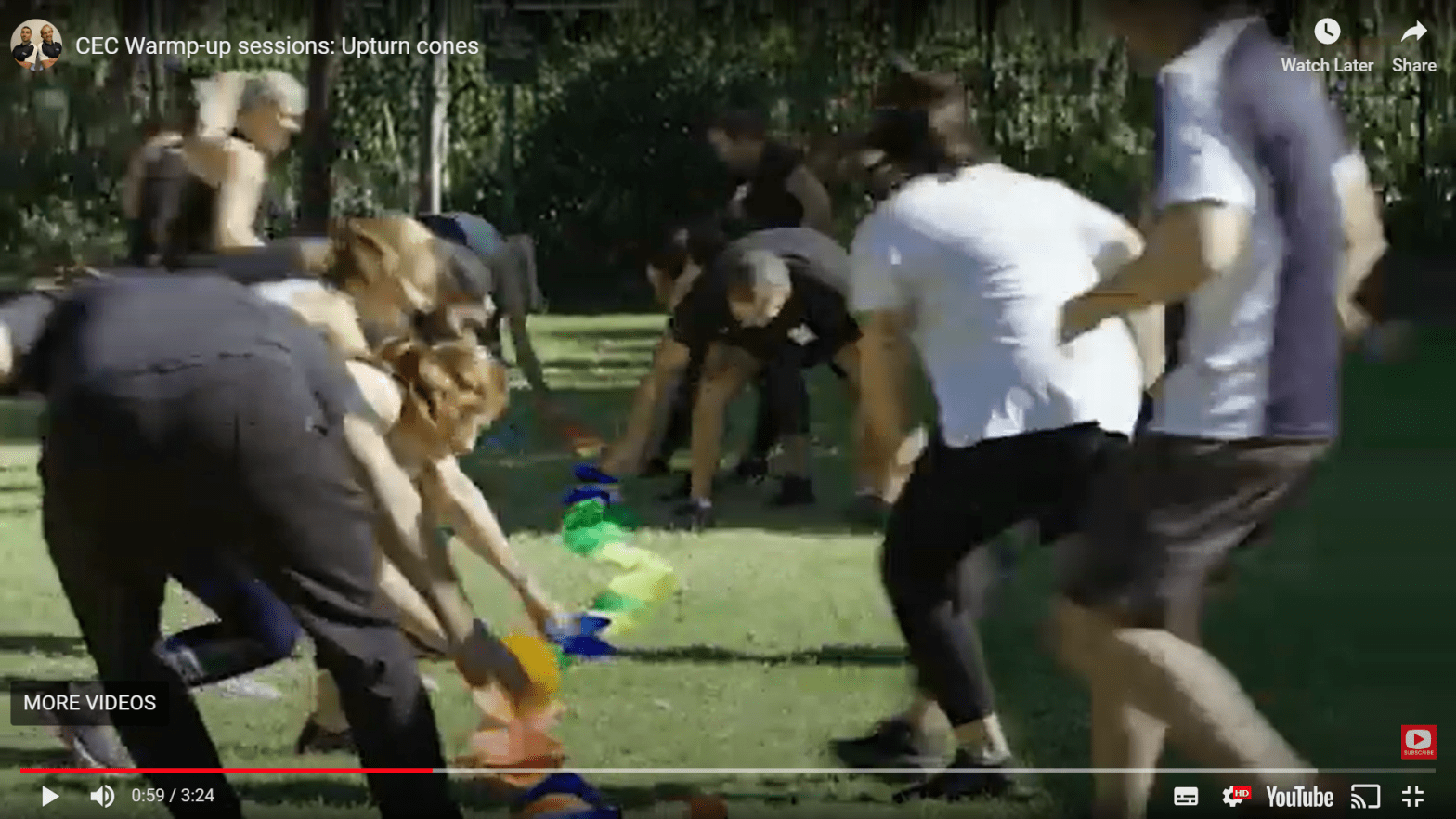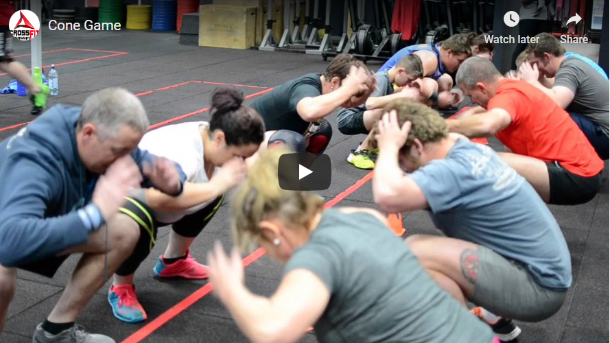 (Group size: pairs) https://www.youtube.com/watch?v=UcL6WlcyBcI Client pairs face each other in squat position, with a cone in between. PT calls out where to put hands eg knees, shoulders, head, hips. When PT says ‘cone’, first person to grab the cone 🏆