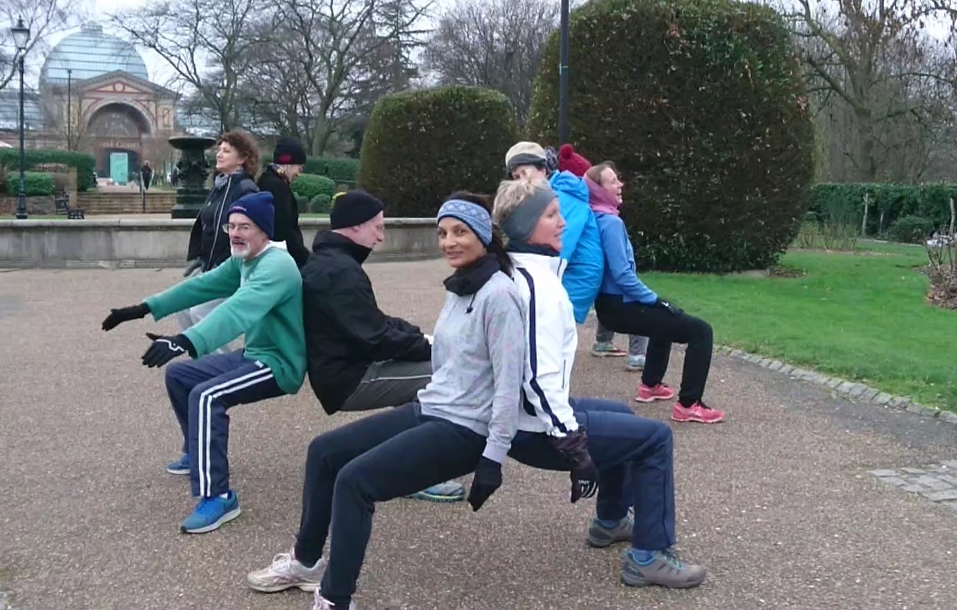 (Group size: pairs) https://youtu.be/3K6XGxO8jhw?t=36 Clients face each other. Tap left foot on partners right foot. Left, right, left, right, squat…repeat for 1-2mins 🦶🏼🪑