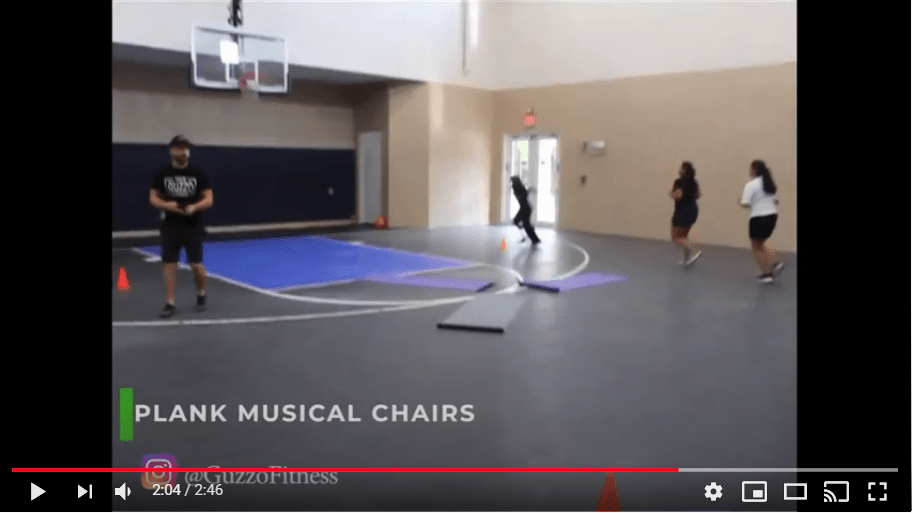 (Group size: 4+) https://youtu.be/Q65K6YWibZ0?t=124 Make a big circle using cones. Put mats in the middle of the circle, one less than number of clients. Clients hop/skip/jump/jog round the circle. Music stops or PT shouts ‘Go’. Clients run to mats and make a plank. Person left standing…forfeit 🎶🪑